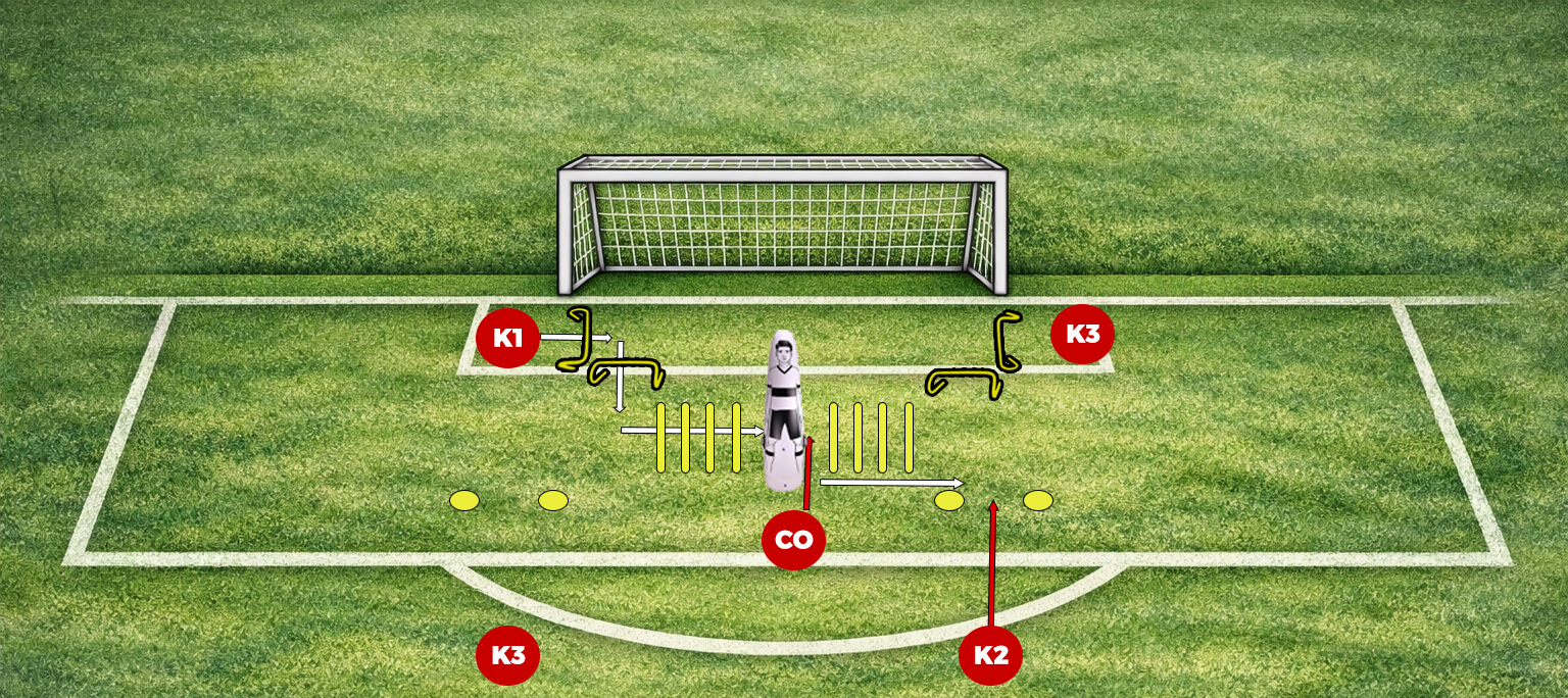 Daarna krijgt K1 een lage bal van de trainer die hij tegenhoudt en terug duwt.